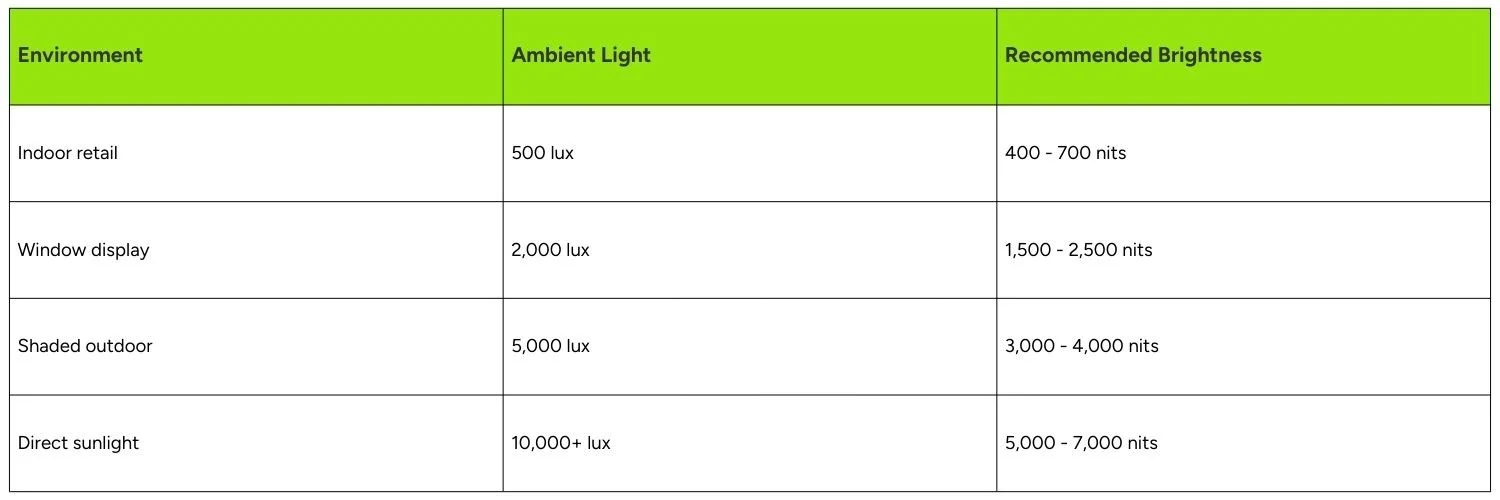 Indoor environments typically need 400–800 nits for comfortable viewing. Outdoor applications demand significantly more to combat sunlight: